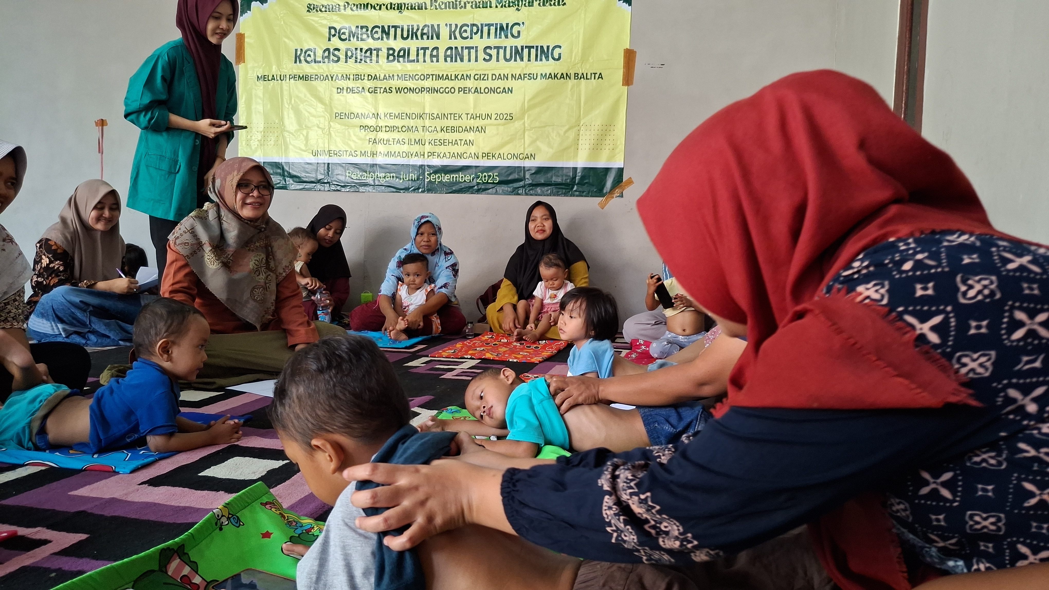 Stunting masih menjadi salah satu tantangan besar dalam pembangunan kesehatan anak di Indonesia, terutama di wilayah pedesaan seperti Desa Getas, Kabupaten Pekalongan. Kondisi gagal tumbuh pada balita akibat kekurangan gizi kronis ini tidak hanya berdampak pada tinggi badan anak, tetapi juga berpengaruh terhadap perkembangan otak, kecerdasan, dan produktivitas jangka panjang. Menyikapi hal tersebut, Prodi Diploma Tiga Kebidanan Fakultas Ilmu Kesehatan Universitas Muhammadiyah Pekajangan Pekalongan (UMPP) berkolaborasi dengan TP PKK Desa Getas, serta didukung penuh oleh pendanaan dari HIBAH Pengabdian Kepada Masyarakat Kemendiktisaintek tahun anggaran 2025 menginisiasi sebuah program inovatif yang bernama KEPITING (Kelas Pijat Balita Anti Stunting). Program ini dilaksanakan selama tiga bulan, mulai Juni hingga Agustus 2025, sebagai bentuk komitmen nyata dalam mendukung percepatan penurunan stunting melalui pendekatan edukatif, preventif, dan partisipatif berbasis masyarakat.